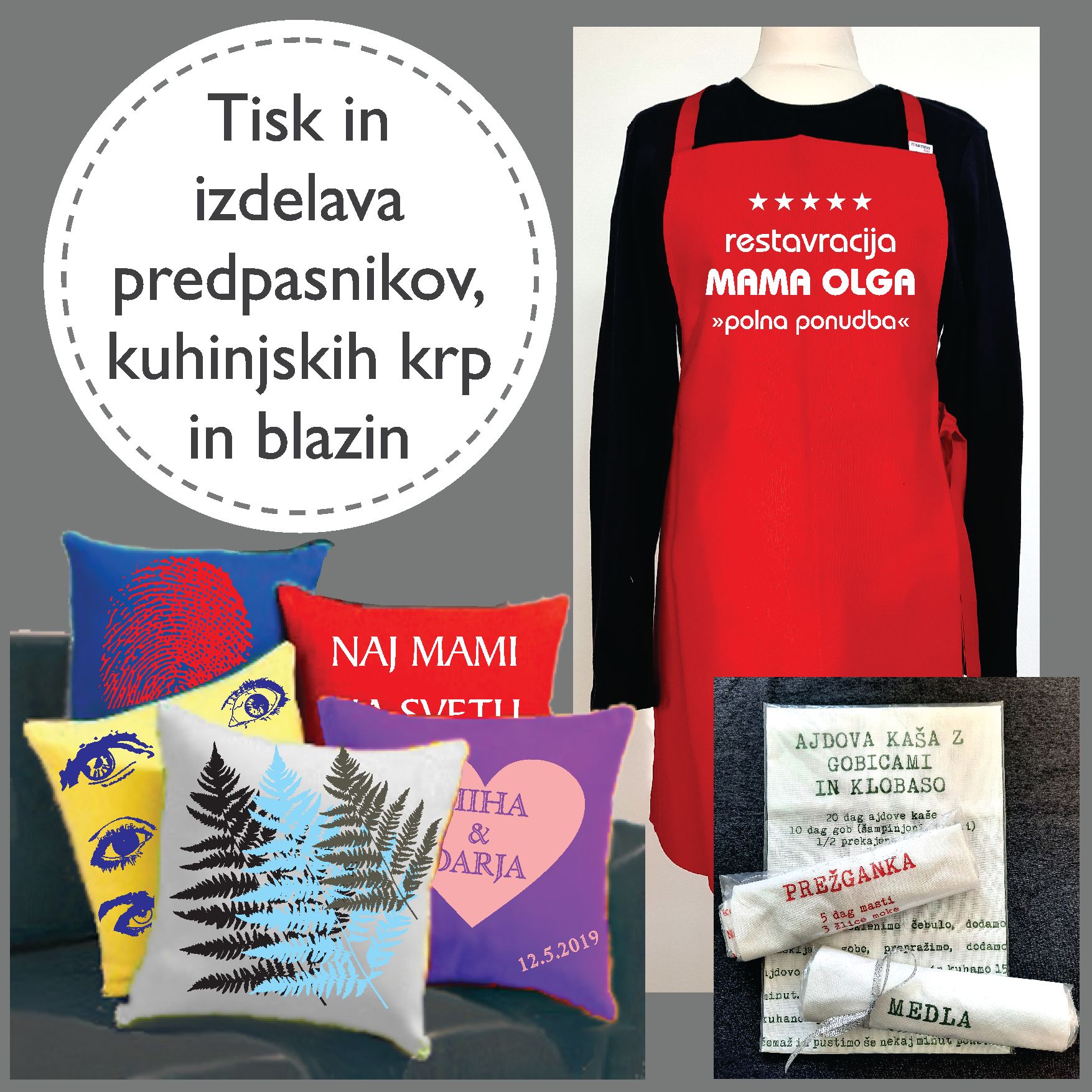 prodaja majic, predpasnikov, tekstilnih torb in okrasnih blazin