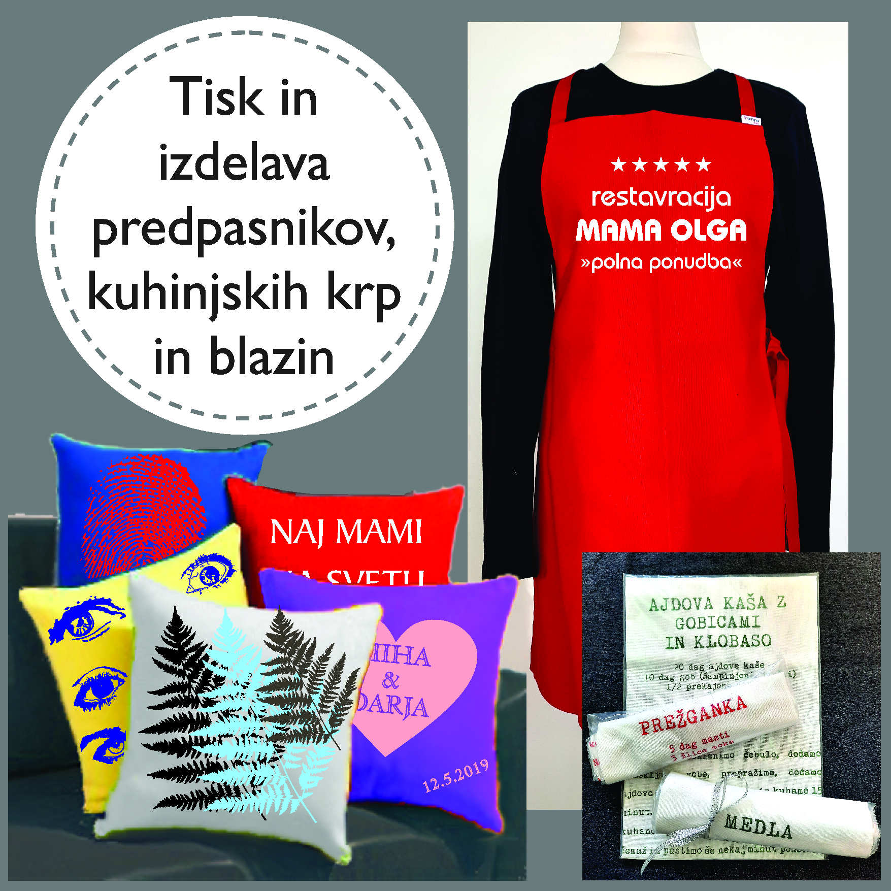 prodaja majic, predpasnikov, tekstilnih torb in okrasnih blazin